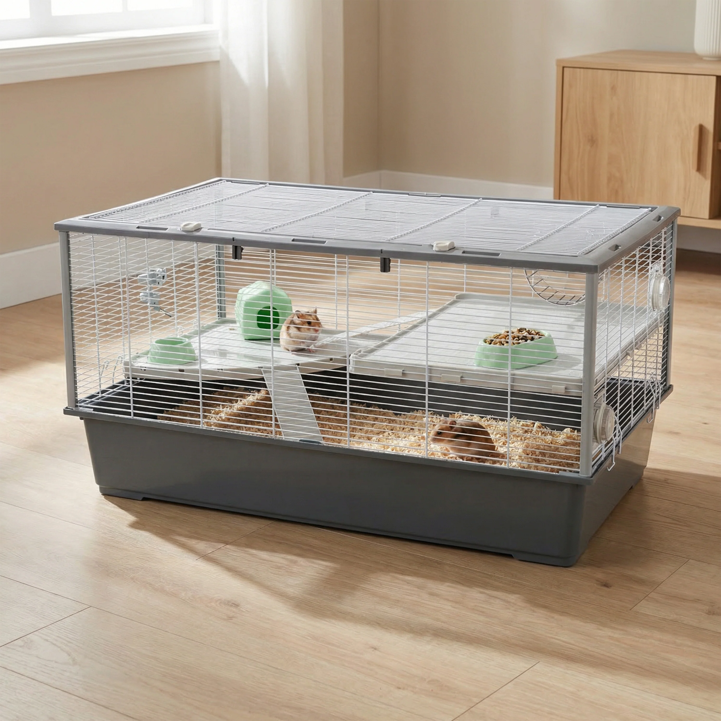 Conforme con las normativas europeas más restrictivas por lo que concierne a las dimensiones de la jaula, Criceti 100 asegura un amplio espacio y confort al hogar de tu pequeño amigo. La jaula está dividida en tres pisos y dispone de repisas con escaleras que crean zonas diferentes, pensadas para cualquier momento del día. Gracias a su base de gran capacidad, el piso inferior contiene la arena de manera eficaz, evitando que se derrame, y permite que el roedor se esconda y se divierta excavando. En los pisos superiores el animal puede comer, beber, jugar o reposarse gracias a los accesorios indispensables incluidos: comederos, bebedero, rueda y nido. Los accesorios se pueden colocar como prefieras en función de las exigencias del pequeño huésped.