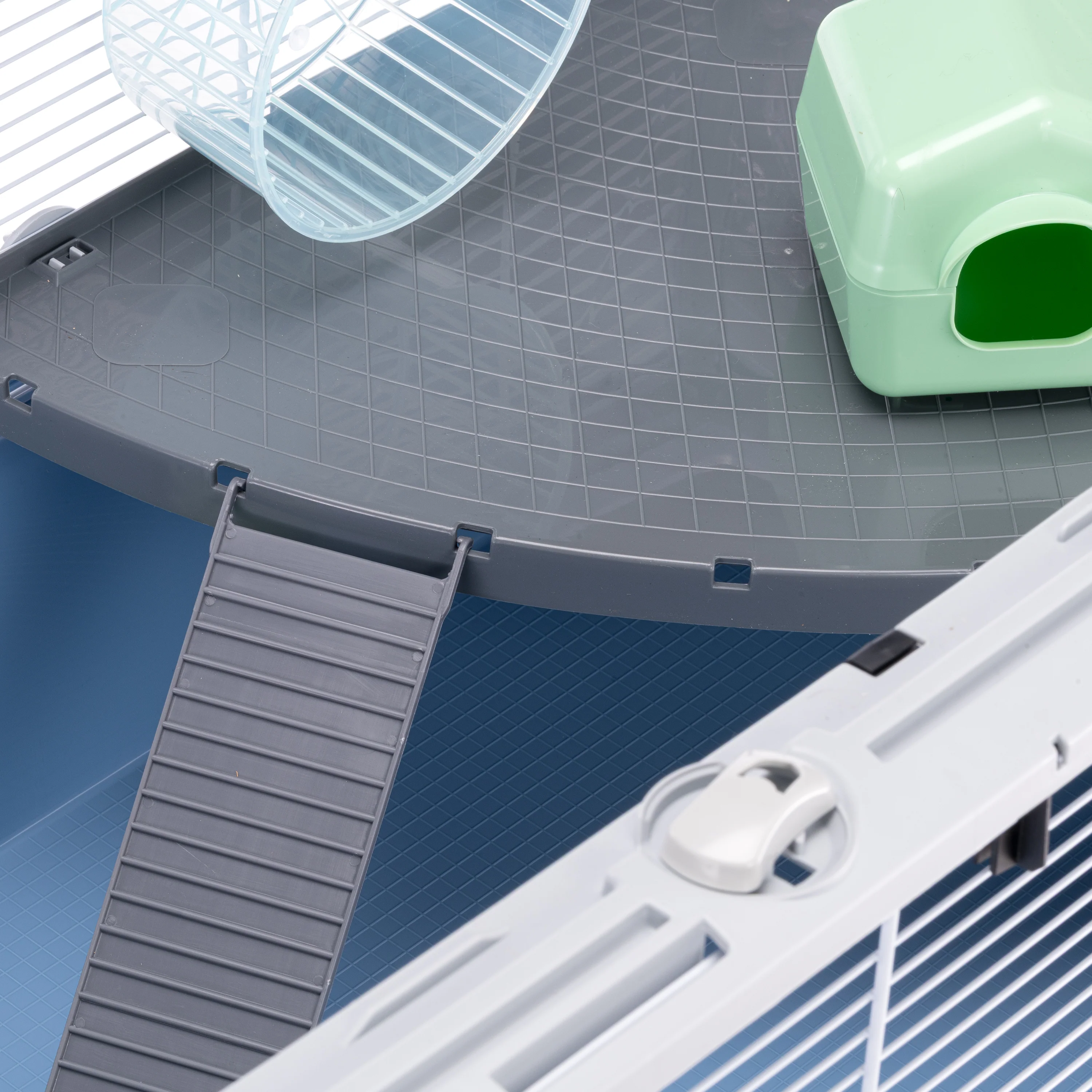 Un amplio estante con escalera divide la jaula en dos niveles, pensados para las distintas actividades del pequeño roedor: el nivel inferior, más tranquilo, es ideal para el descanso, mientras que el nivel superior resulta perfecto para comer, beber y jugar.