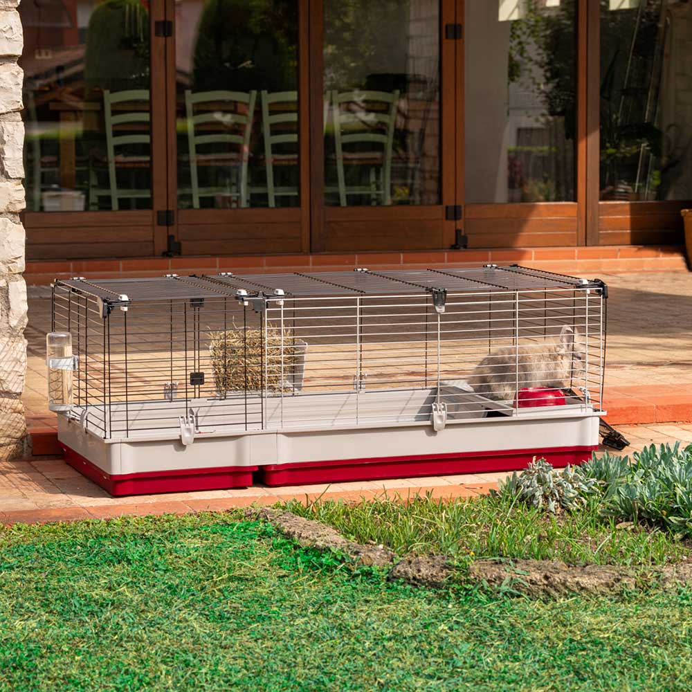 El modelo Krolik 140 es muy espacioso, ideal para alojar a varios conejos juntos e incluye todas las comodidades: en el interior, cuenta con una cómoda casa de plástico con cuenco, comedero de heno y bebedero. Además, en el lateral de la jaula encontrarás una cómoda escalera que permite al animal salir y entrar de forma independiente y moverse libremente por la casa. El hábitat se completa con una extensión de 40 cm de longitud, separada de la jaula principal por una rejilla especial desmontable. Este módulo es ideal para permitir que los conejitos construyan su propio nido dejándoles toda la tranquilidad que necesitan.
