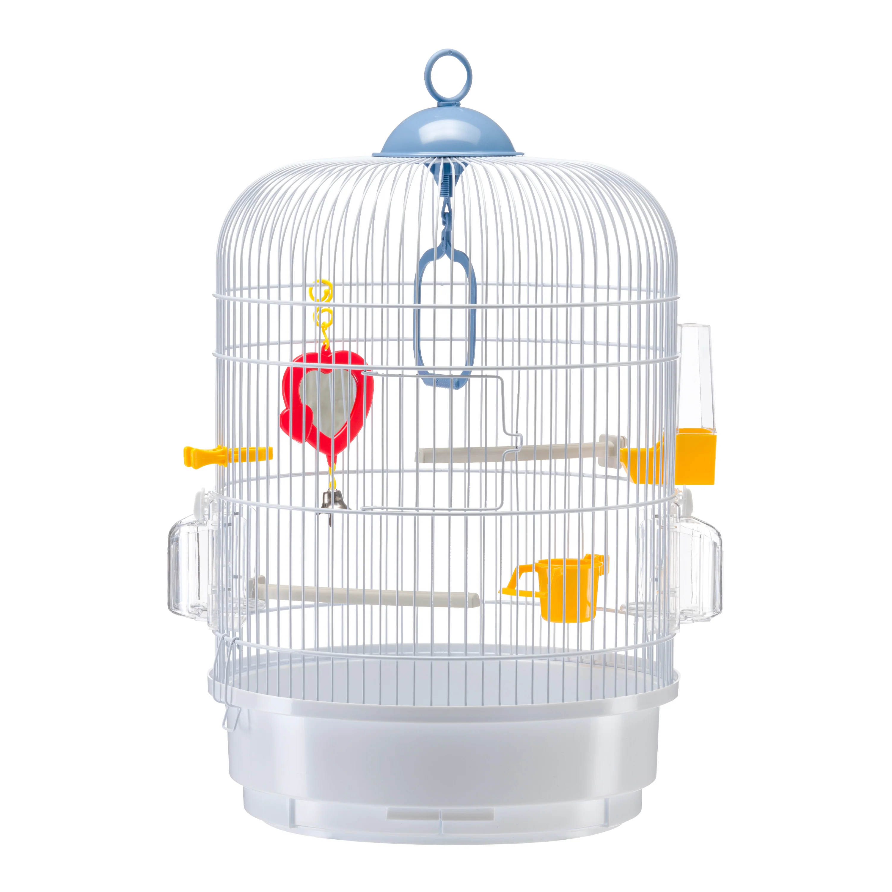 Regina es una jaula redonda, pequeña y elegante, para canarios, aves exóticas y otras pequeñas aves. Esta versión con malla de alambre revestida de cobre puede ser colocada o enganchada a uno de nuestros soportes de plástico. La base de plástico tiene dos pequeñas bandejas extraíbles que hacen que la limpieza diaria sea apenas sin esfuerzo. Las jaulas Regina vienen completas con accesorios, incluyendo un columpio, un espejo-juguete con una campanilla, perchas de plástico, un bebedero, un clip de alimentos, un alimentador para puré y los alimentadores Brava 1 giratorios.